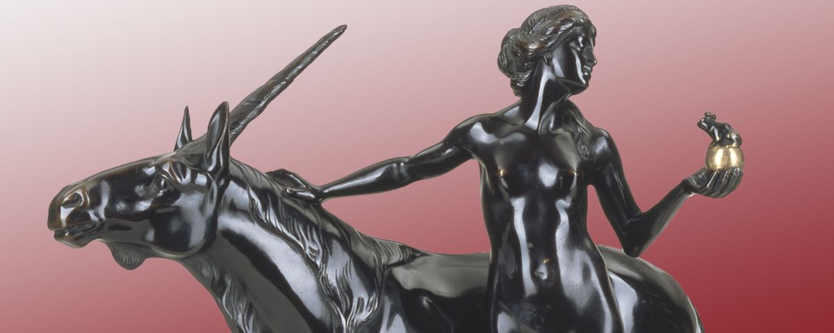 Bild: Ein Kombi-Märchen: Die Dame mit dem Einhorn und Die Prinzessin und der Froschkönig, Rudolf Henn (1880-1955): Märchen, vor Juni 1905, Bronze, (c) 2025, LETTER Stiftung, Köln, Photo Jean-Luc Ikelle-Matiba